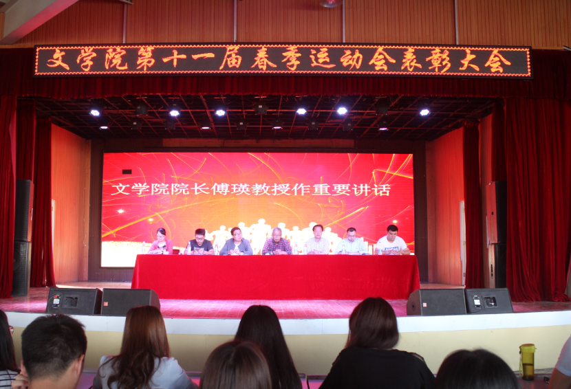 2018年5月23日下午,文学院在大学生活动中心举办第十一届春季运动会表彰大会,参会人员有文学院院长傅瑛教授,副院长毛正天教授,党总支书记张甲楠,行政秘书陈俊,学生干事徐远东,教学干事王松,团总支书记王艳艳,全体辅导员,团总支学生会全体成员及全体运动员。会议由张甲楠主持。