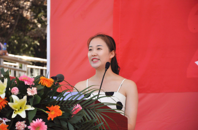 会议伊始,全体起立,奏唱国歌。紧接着,2019级汉语言文学本科2班邢若琳同学代表新生发言,她希望自己能够通过主动学习,用大学四年的生活来提升自己,求真务实,开创属于自己的人生舞台;老生代表2017级汉语言文学本科2班郭天同学在发言中,告诉19级的同学们,大学是一个全新的体验,要学会自主选择生活方式,潜心前行,追求青春之理想。优秀校友代表2019届毕业生罗倩依次发言,她就英语,参与社团活动,考研准备等几个方面和19级同学进行指导,并期望19级学生能抓住时机,奋发向上,努力学习。