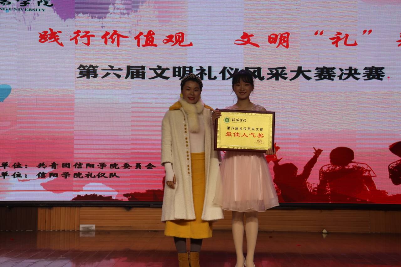 在最后的走秀环节,文学院礼仪队伴随着轻巧的音乐,踏着带感的步伐为大家带来了一场精彩的视觉盛宴:女生们衣着靓丽引人注目,男生们西装领结仿佛大人模样,独具一格,赏心悦目,赢得了台下观众的阵阵掌声。经过各位评委的认真评审,在礼仪风采这一比赛环节中,我院得分5.67分;在走秀这一比赛环节中,我院得分2.69分。我院最终取得总分8.36分的优异成绩,荣获一等奖与最佳人气奖,赢得了全场的祝贺与热烈的掌声。