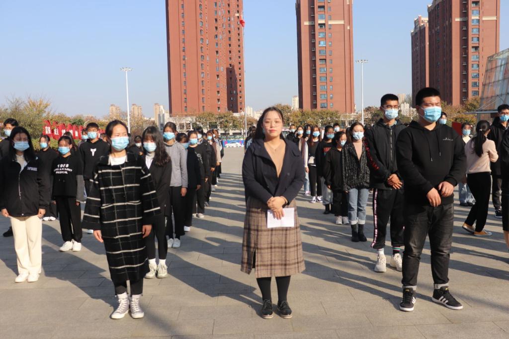 首先由国旗护卫队敬献花篮,全体人员默哀,缅怀抗美援朝英雄先烈。国旗护卫队请出团旗,全体团员面向团旗重温入团誓词,由学生代表李燚超同学领誓。
