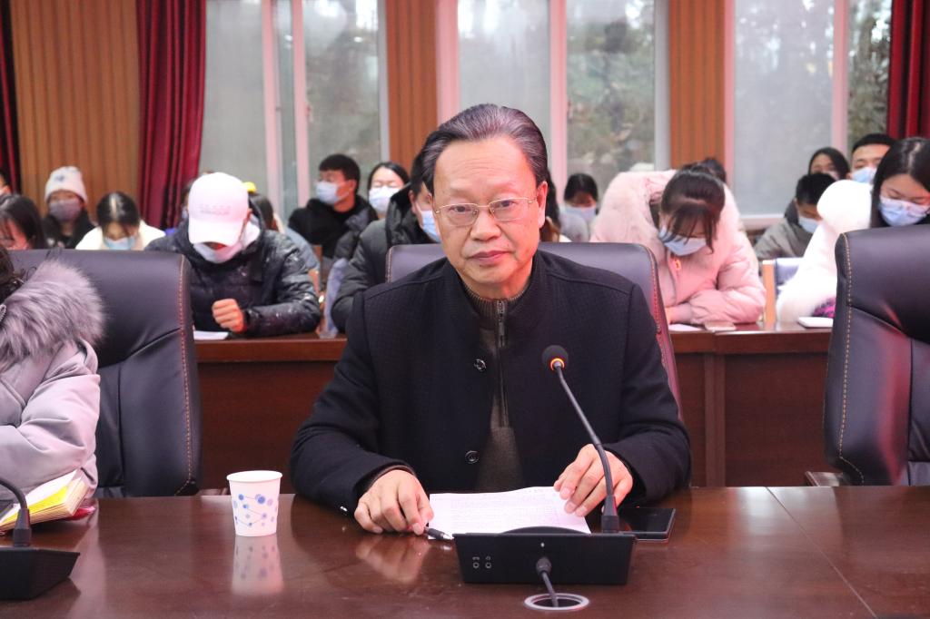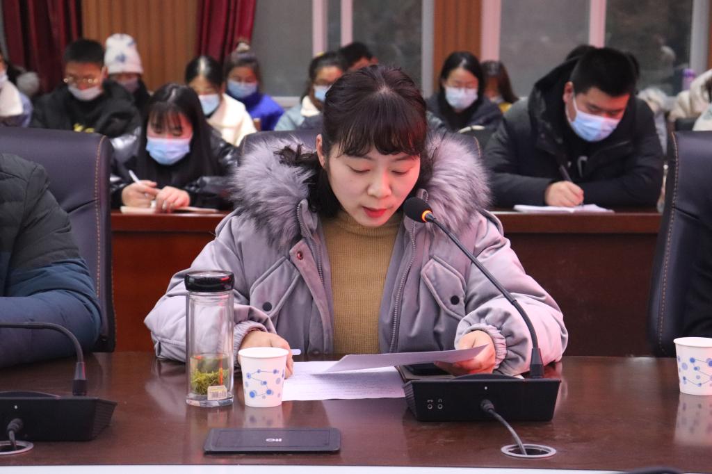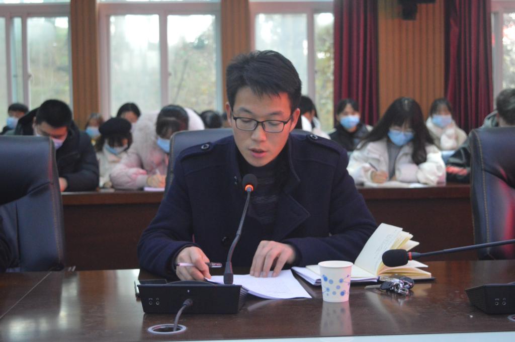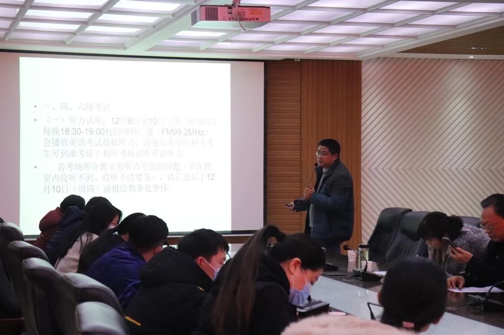 教学秘书陈浩对英语四、六级考试及期末考试做出具体工作安排。行政秘书陈俊对信阳学院普通本、专科学生违纪处分的相关文件进行宣读。学工秘书徐远东对学风建设相关工作予以安排,他对文学院荣获全校学风建设先进单位的成就表示肯定,并对于申请单位评选和先进班级集体评选的硬性标准进行阐释。