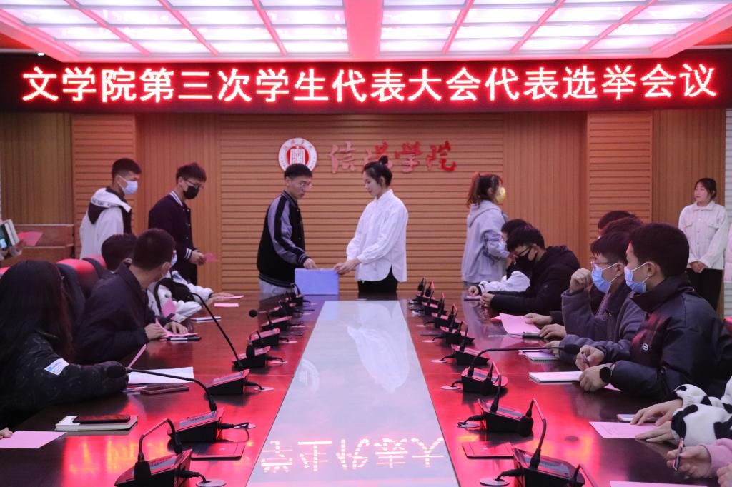 此次选举采用无记名投票的方式,将从50名预备人选中选出42名参加第三次学生代表大会,在监票人的监督下,由我院各年级班委组成的50名学生代表进行投票选举,最终选举出42名同学为信阳学院第三次学生代表大会代表,会议圆满结束。