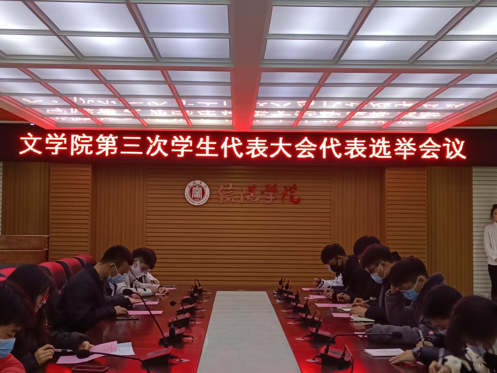 为深入贯学习彻党的十九大精神,深入落实《学联学生会改革方案》《关于推动高校学生会(研究生会)深化改革的若干意见》,增强学生会动力,激励学生积极向上、奋发图强,以服务青年成才为宗旨,深化贯彻社会主义核心价值观,全面落实党的人才培养计划,加强广大青年学生敢于拼搏的精神。我院于11月24日在人文楼208会议室召开了文学院第三次学生代表大会,正式选举出席信阳学院第三次学生代表大会代表,会议由团总支书记何军华主持。