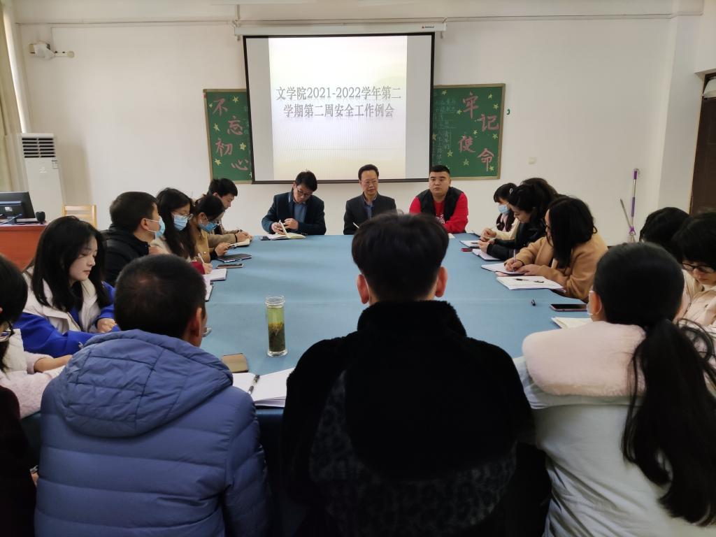 2月28日上午,我院在人文楼114会议室召开本学期第二周安全工作例会,出席本次会议的有文学院院长毛正天、党总支书记李赟、学工秘书徐远东、团总支书记何军华及全体辅导员。会议由徐远东主持。