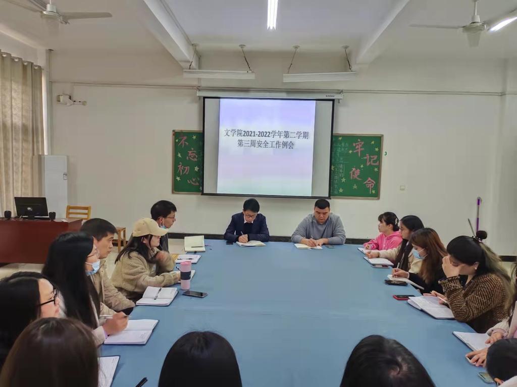 3月7日上午,我院在人文楼114会议室召开本学期第三周安全工作例会,出席本次会议的有文学院党总支书记李赟、学工秘书徐远东、团总支书记何军华及全体辅导员。本次会议由徐远东主持。