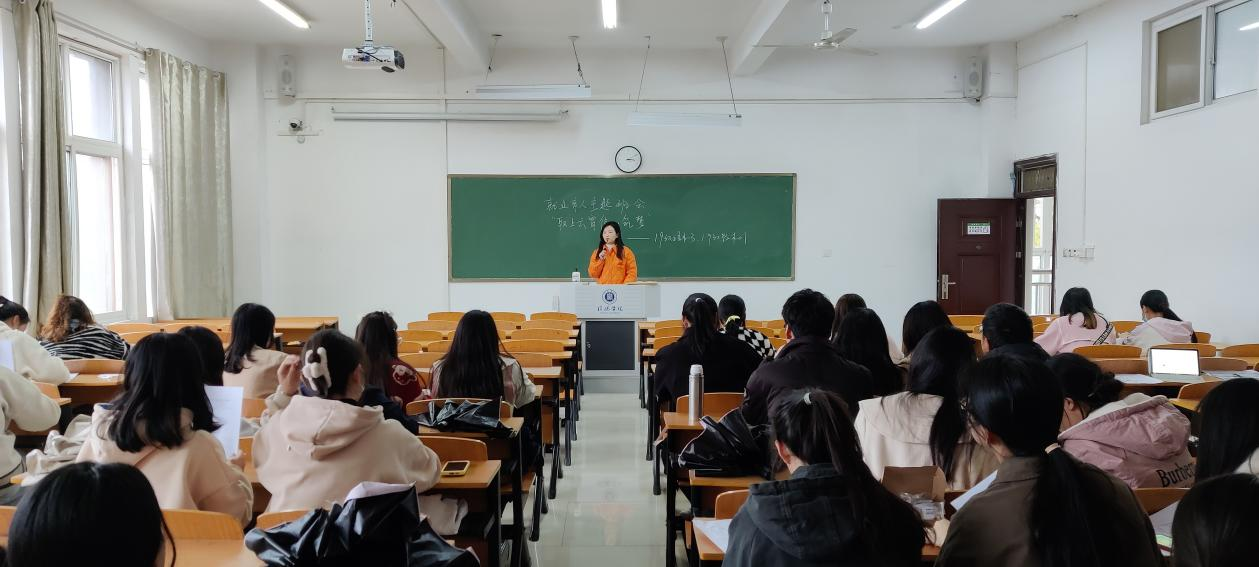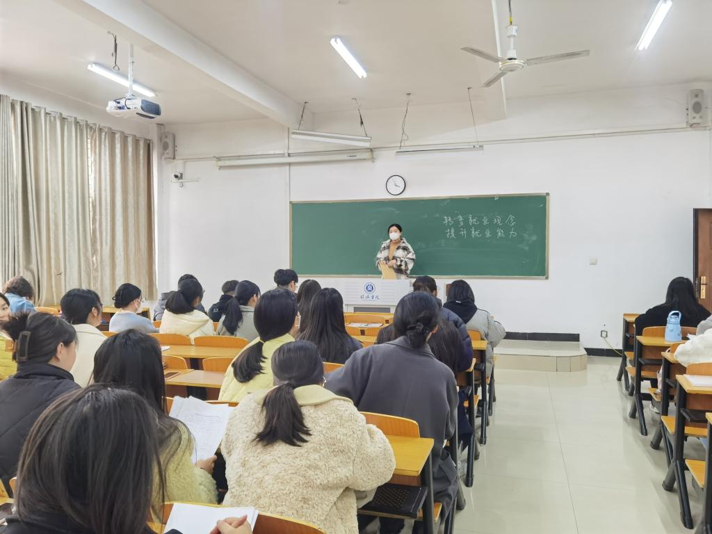 豁艳老师向学生介绍文学院毕业生就业的主要去向,所从事的行业和所在的相关单位,以及工作所在地的大致分布情况。并通过案例分析及面试情景介绍,为同学们求职指明了方向。