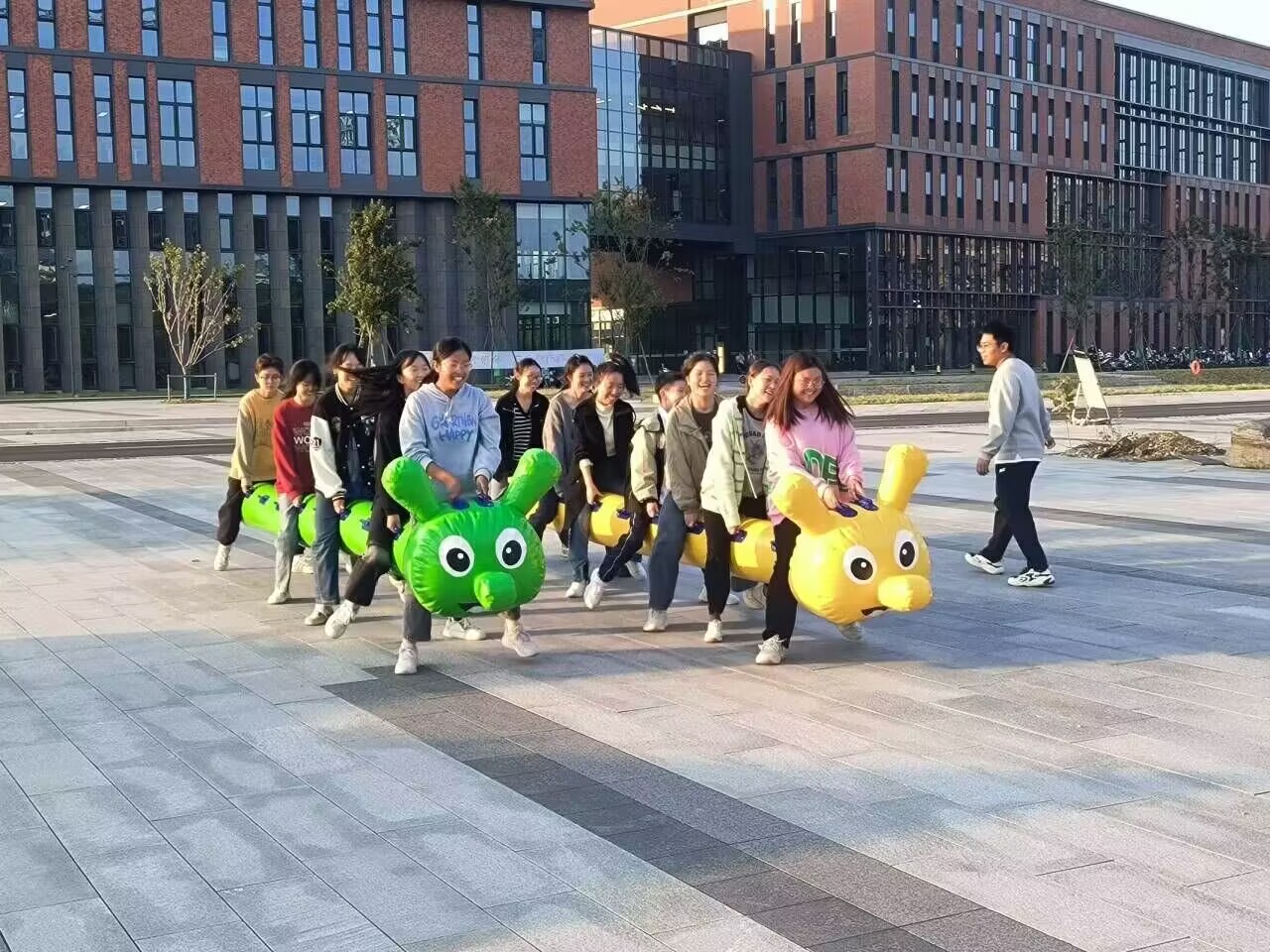 线下活动在文学院教学楼旁小广场展开,在“疯狂毛毛虫”游戏中,成员分为两队,带动毛毛虫道具在跑道上行驶,增强了团队协作能力,拉近彼此距离;在“奇异服装接力”游戏中,通过组队抽签的方式,促使成员完成接力游戏,更好地培养团队意识,增进友谊。其余更有“一起来拍照”“飞运羽毛球”等丰富多彩的游戏方式。