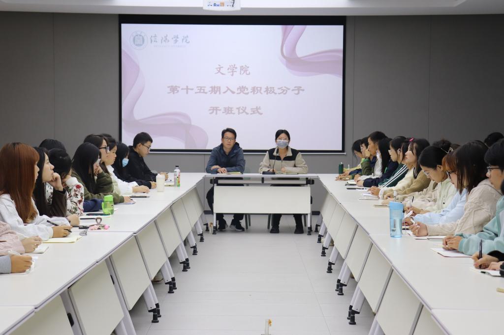 为加强新一期积极分子思想教育,提高积极分子党性觉悟,2023年11月7日晚上7点,我院在406教室举行文学院第十五期入党积极分子培训班开班典礼暨“做新时代硬核共产党员”主题党课教育活动。文学院党总支书记李赟、辅导员湛世霞和文学院第十五期积极分子参与此次活动,本次活动由湛世霞主持。