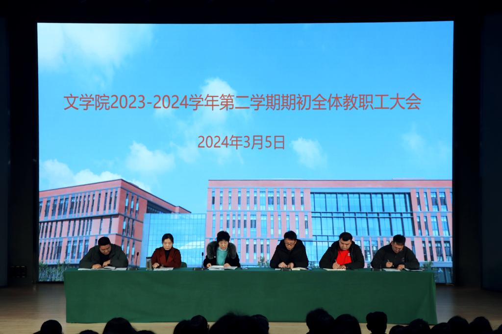 为传达学校2024年工作要点,全面部署文学院新学期各项工作,3月5日下午,我院于教学楼113召开文学院2023-2024学年第二学期期初教职工大会。文学院院长张凌江、党总支书记李赟、教学副院长黄亚妮、教学秘书陈浩、行政秘书陈俊、学工秘书徐远东及全体教职工参加本次大会,大会由党总支书记李赟主持。