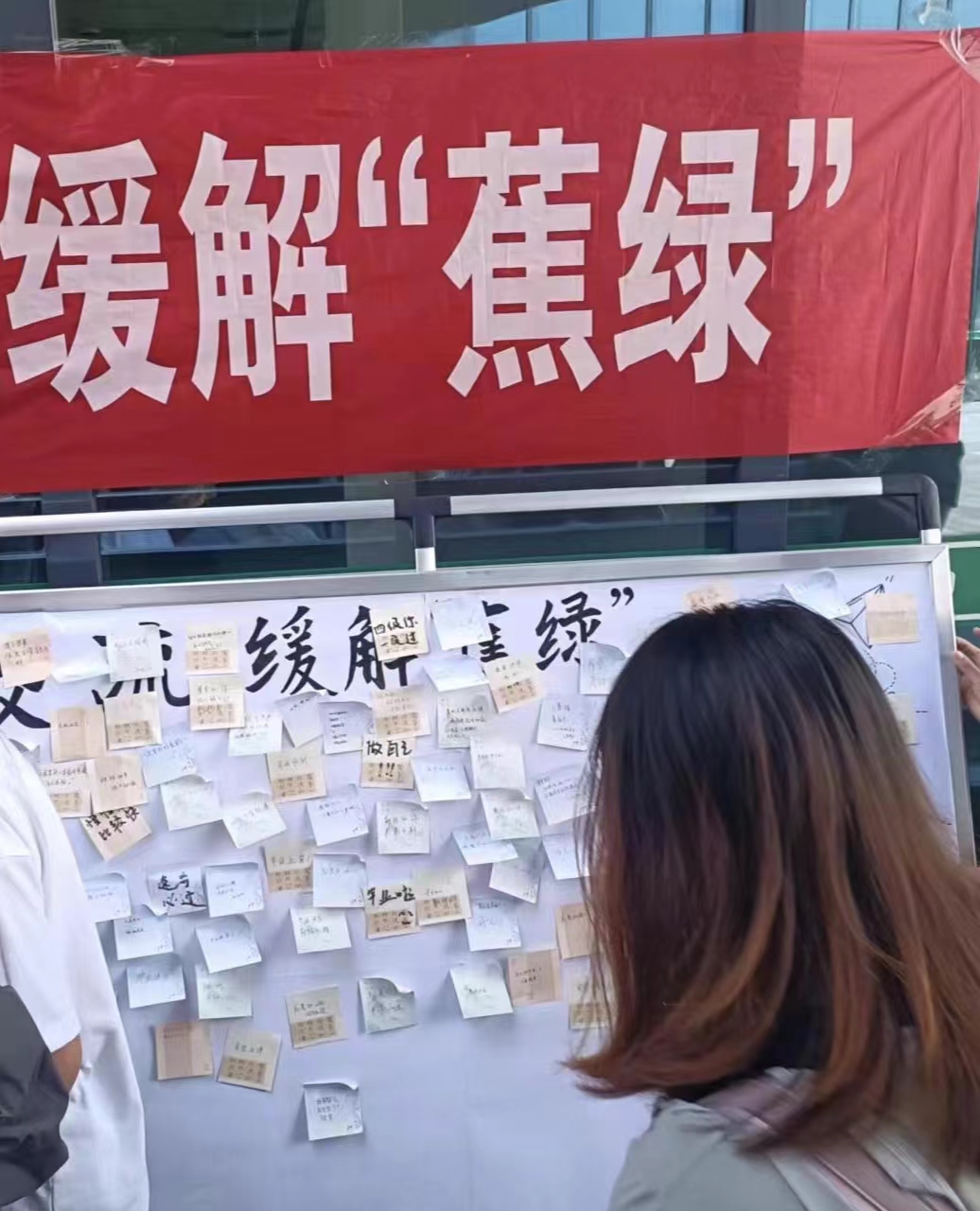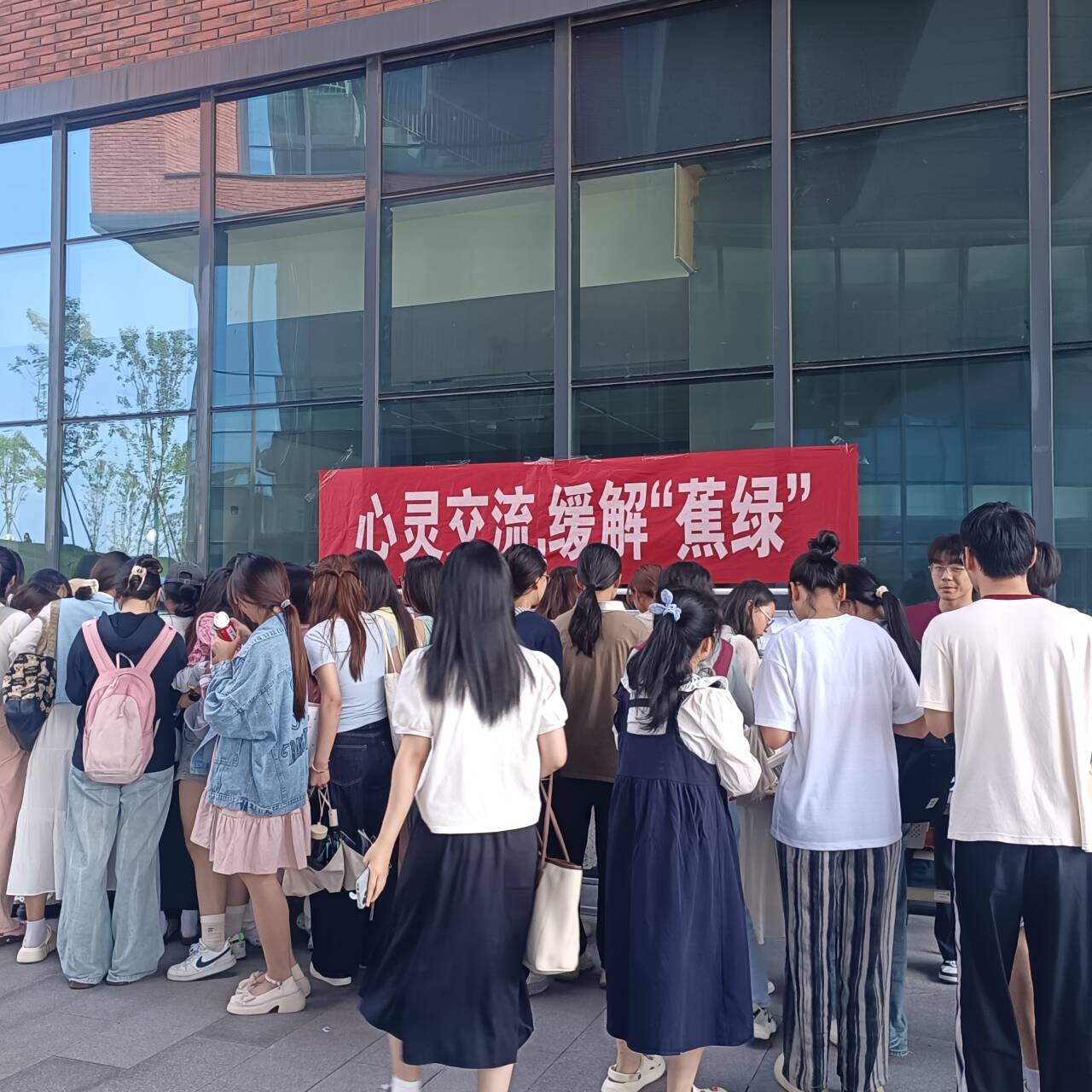 为缓解学生学业焦虑,保持心理健康,6月6日到6月7日,我院在教学楼连廊处举办以“心灵交流,缓解‘蕉绿’”为主题的心理健康活动。本次活动由千千结艺社、玄墨书法协会主办,学生会社团部及心理健康部共同承办,面向文学院全体在校学生展开,采取线下活动方式进行。