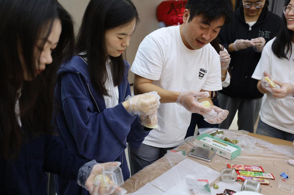 活动伊始,“冰皮月饼手作”环节便迅速拉近了师生距离。在段艳婷老师的演示下,大家围坐一堂,揉皮、包馅、压模,协作默契。印有国旗和月亮图案的模具制作出的不仅是香甜的月饼,更是师生间携手合作的温情与对家国团圆的美好祝愿。现场气氛温馨,其乐融融。