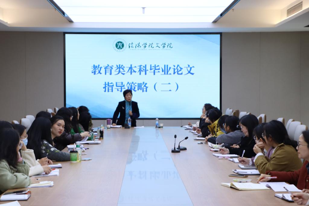 为提升教育类论文指导质量,11月25日下午,我院特邀教育学院蔡梅、刘爽两位教师,于教一楼406会议室开展题为《教育类本科毕业论文指导策略(二)》专题讲座。文学院院长张凌江,及全体无授课任务的教师参加。