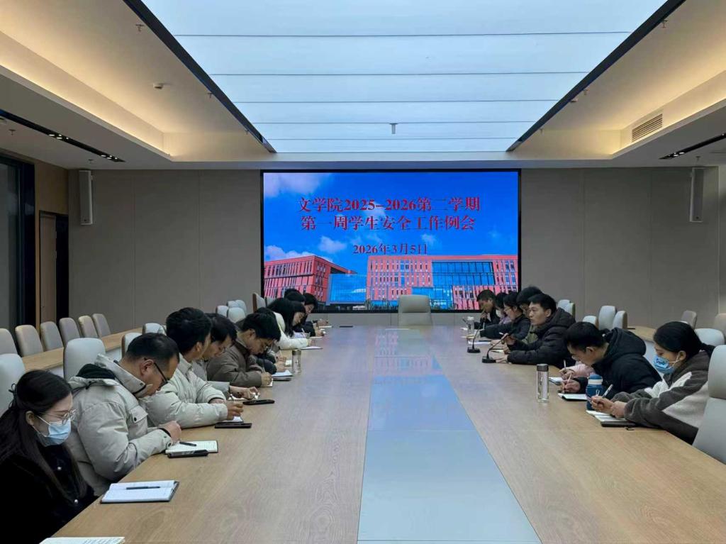 2026年3月5日,文学院召开2025-2026学年第二学期第一周学生安全工作例会,全面部署新学期学生安全与教育管理工作。文学院党总支书记李赟、学工干事何军华及全体辅导员参加会议。