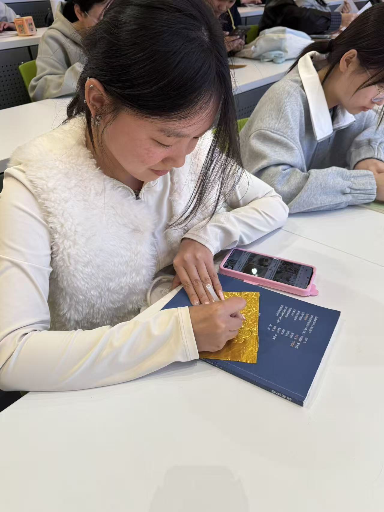 理论讲解与知识竞答结束后,进入沉浸式手工创作环节。在学生会工作人员的指导下,同学们充分发挥想象力与创造力,将阅读感悟、文学意象、诗词意境融入创作,以锡为纸、以刀为笔,精心勾勒、耐心雕琢。现场秩序井然,创意氛围浓厚,大家在动手实践中放松身心、锤炼耐心,收获创作的喜悦与成就感。