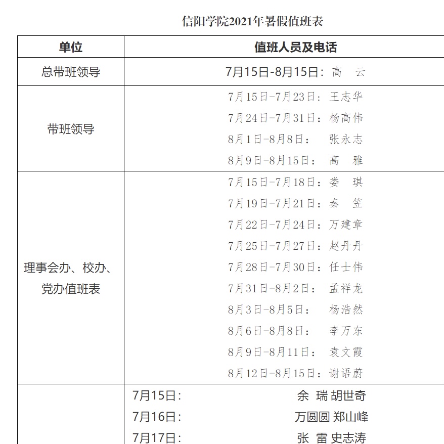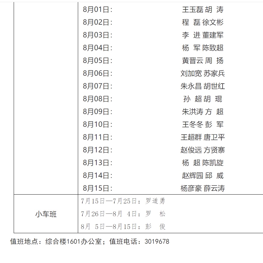 4.值班安排。暑假期间,除学校统一安排有关单位和人员在总值班室(综合楼1601室)值班外,其余单位根据实际情况安排专人值班或电话值班。各单位负责人要切实负起责任,督促值班人员按时到岗并保持24小时手机通信畅通,保证各项工作稳定有序运转。