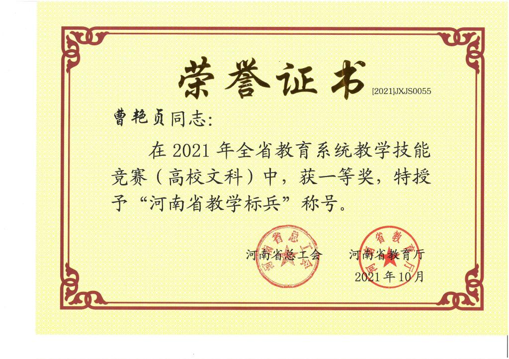 近日,从河南省总工会、河南省教育厅传来喜讯,在2021年河南省教育系统教学技能竞赛中,我院曹艳贞教师获得了一等奖并被授予“河南省教学标兵”荣誉称号。