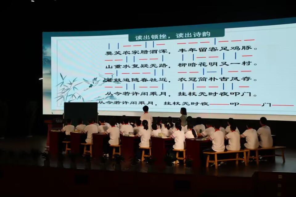 马金枝老师课堂教学内容侧重于哲理诗。授课过程中,她从哲理诗的常见内容,表现形式和阅读方法三个方面进行讲解。从《游山西村》入手,以多种朗读形式使同学们读准字音,感悟节奏,体会顿挫,领会诗韵,达成有感情朗读的课堂效果。随后,她从自然景物、社会政治、人生理想、艺术哲理四方面讲述哲理诗的常见内容,并从借景喻理、即事说理、托物说理三方面讲解哲理诗的表现形式,最后她从字面解读、形象分析、哲理感悟三方面层层递进,阐明哲理诗的阅读方法。