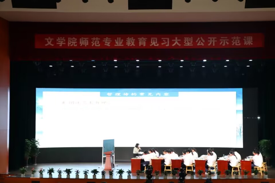为进一步巩固专业理论知识,加强学生实践教学能力,更好将实践课程与课堂教学有机结合。我院于6月4日邀请信阳市九中马金枝老师以及32名中学生在音乐厅开展大型教育见习公开示范课。文学院院长毛正天、党总支书记李赟、教学副院长黄亚妮、2020级全体辅导员及近900名学生参加了此次活动。公开课由教学副院长黄亚妮主持。