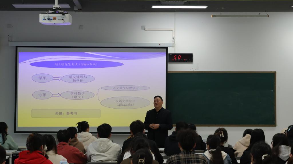 为给学科语文考研考生提供备考指导,助力考生明确方向、高效准备。10月16日下午,我院特邀信阳师范大学文学院副教授杨传凯于南湖校区教一楼106教室召开了以“语文课程·教材·教学一体化设计探究”主题的讲座。文学院有考研意向学子参加了此次讲座。