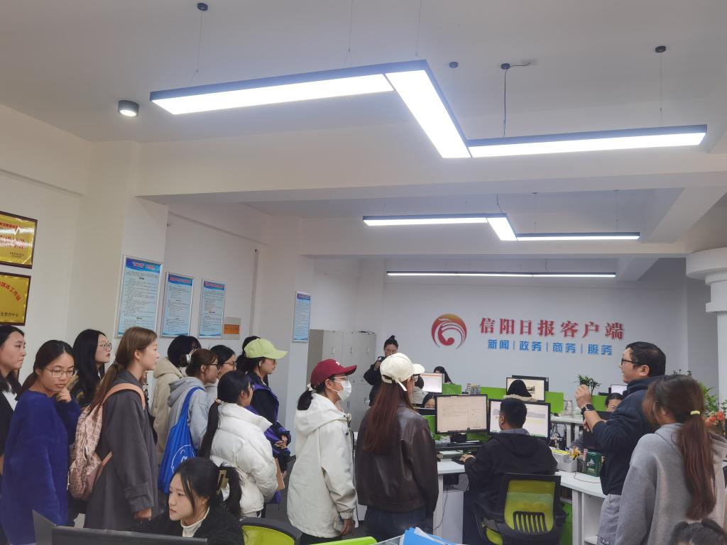 在信阳日报报业大厦,师生们实地参观学习强国信阳学习平台工作室、融媒体视频部及客户端工作部,直观感受融媒思维下媒体内容的采编模式、生产流程与平台运营模式。