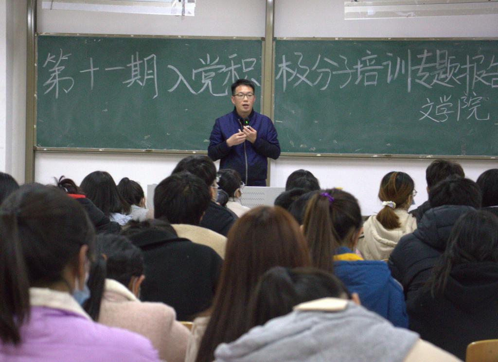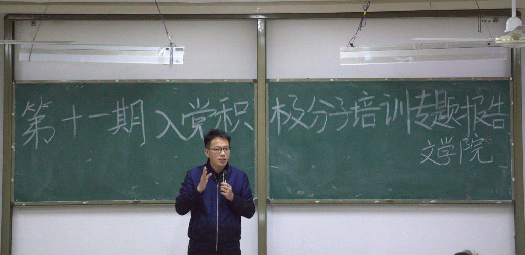 为提高入党积极分子的党性修养,11月23日晚上7点,我院在人文楼308教室举行文学院第十一期入党积极分子培训专题报告会。报告会由文学院党总支书记李赟主讲, 142名入党积极分子共同参加学习。