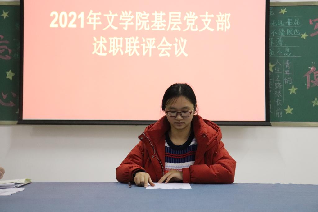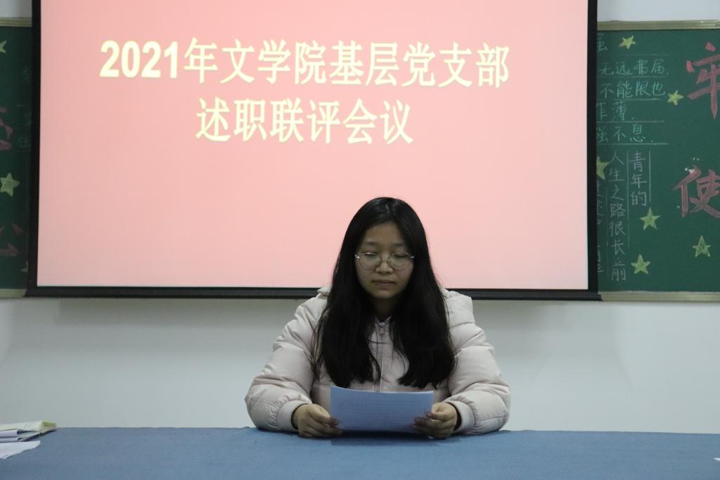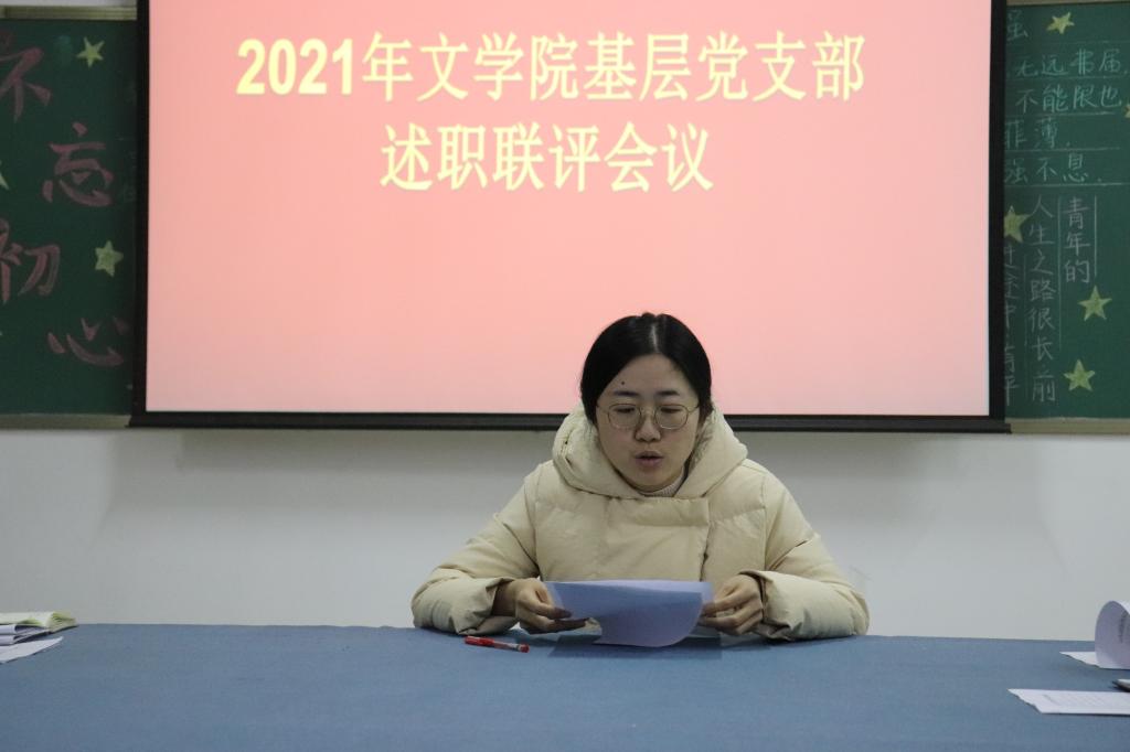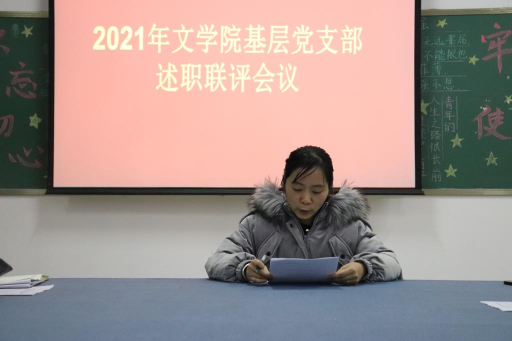 文学院党总支书记李赟对各基层党支部书记述职情况总结点评。对教工党支部与学生党支部分别提出了新要求,要求各支部持续抓好学习,按照创建学习型组织的要求,深入学习习近平新时代中国特色社会主义思想;学习贯彻党的十九届六中全会精神;持续开展党史学习教育,学习形式要多样化,结合各党支部情况定期深入开展主题党日活动;创新党建活动形式,形成干事创业合力,保障教育教学和文学院各项事业的发展。