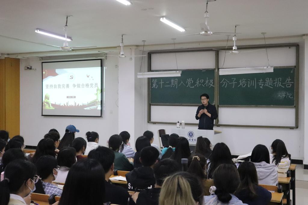 为进一步加强对入党积极分子的培养工作,切实增强入党积极分子的党性修养和历史使命感,4月22日,我院在人文楼108教室召开了以“坚持自我完善,争做合格党员”为主题的积极分子培训专题报告会。此次报告会由文学院党总支书记李赟主讲,138名入党积极分子共同参加学习。