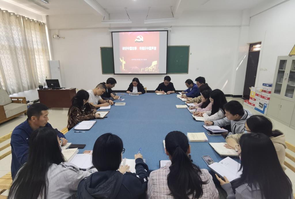 接下来全体党员围绕高校教师如何给当代大学生讲好中国故事,传播好中国声音进行了讨论。李赟书记说,我们要讲好中国故事,就要做好文化育人,可以在宿舍、教学楼的的公共空间,张贴有文化氛围的图片,字样,通过文化符号的形式进行文化育人;何军华老师说,文学院有80个团支部,我们可以通过召开主题团日活动、观看红色电影、参观博物馆、纪念馆、参加公益活动,宣传好人好事等方法来讲好中国故事,传播好中国文化;王松老师说,我们文学院有现代汉语这门课,可以给同学们讲汉语的演变过程、成语中的寓言故事,神话故事、汉字的发展过程等;姬荷馨老师说,利用好跨文化交际这门课,给同学讲中国传统文化、中国梦等内容。最后段艳婷总结指出,我们支部的每一个党员都要在自己的岗位上发光发热,努力讲好中国故事,传播好中国文化。