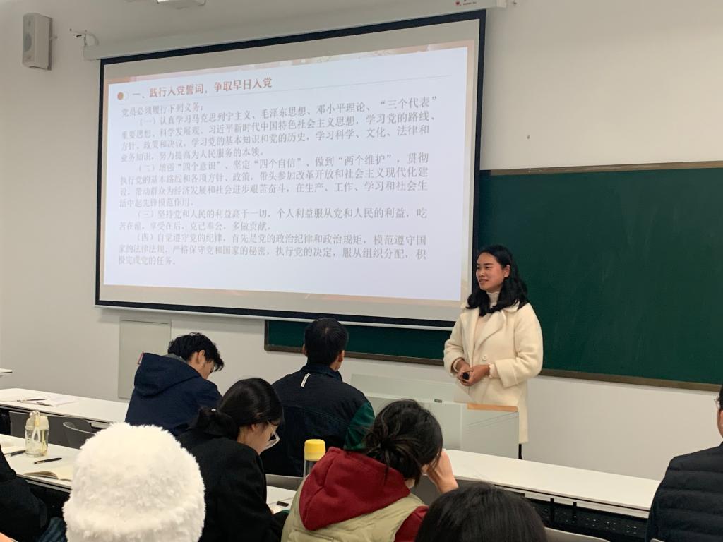湛世霞为学员们介绍了入党流程,要求大家务必端正入党动机,保持坚定的信仰;冯乐同样表示,要牢记入党誓词,履行党员义务,以身作则将党的纪律牢记于心;不忘初心,方得始终,常歌要求学员们在新时代里仍然要保持党员先进性。