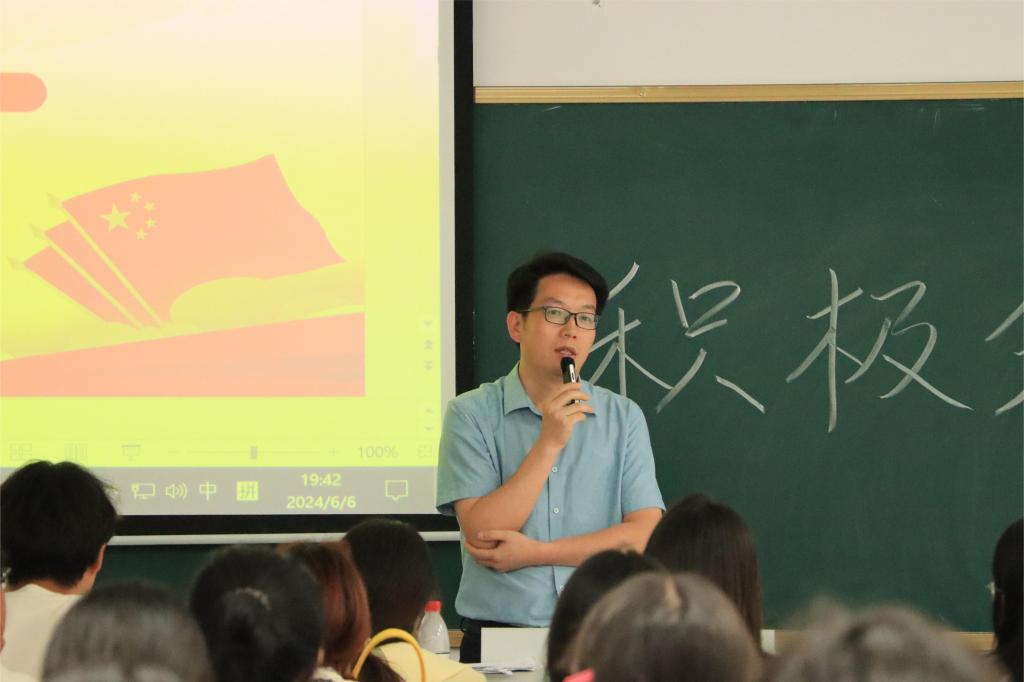 党总支书记李赟主要从以下三个方面对入党积极分子进行培训教育:一、端正入党动机,解决“为什么入党”的问题。二、提高能力素质,解决“怎么去做”的问题。三、加强党性锻炼,解决“如何当好”的问题。书记在讲话中强调,作为新时代的积极青年入党分子,要始终坚定理想信念,砥砺出众能力,以成为预备党员为重要起点,追求更高人生目标,勇担党和人民赋予的历史使命,在新时代中做出青年人应有的贡献。