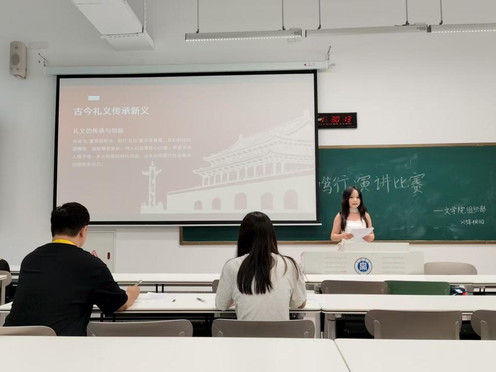 与此同时,在教一楼207教室举行的演讲比赛中,选手们围绕主题从容自信、声情并茂地展开演讲。其中,常煜惠同学以《讲宪明礼仪,竞知笃行》为题,从“宪”“礼”“知”“行”四个维度深入剖析了宪法精神与日常行为规范的内在联系。在论及“宪”与“礼”的关系时,她指出宪法作为硬约束与礼仪作为互相滋养相辅相成,并呼吁大家跨越知行鸿沟,将知识转化为实践,争做“宪法卫士”“礼仪使者”,更要成为“终身学习者”与“积极行动者”。