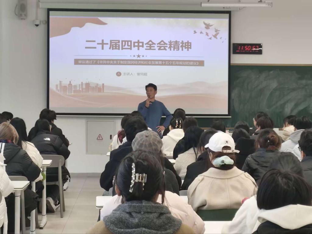 11月20日,訾同超老师以学习贯彻党的二十届四中全会精神为主题展开授课。他系统解读了“十五五”时期经济社会发展必须遵循“六个坚持”原则,深入阐释了全会提出的高质量发展、科技自立自强、区域协调发展等重点任务,帮助同学们厘清历史脉络、把握时代要求,深刻认识到当代大学生们应该承担的重任。