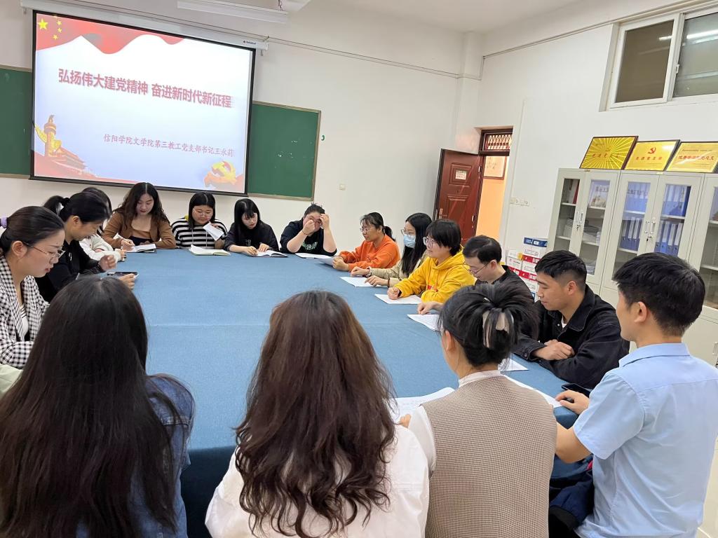 为深入贯彻落实全党深入开展学习贯彻习近平新时代中国特色社会主义思想主题教育有关要求,推动本次主题教育走深走实、取得实效,进一步加强和改进信阳学院文学院党支部党建工作。5月11日,信阳学院文学院第三教工党支部书记王永莉为本支部党员做了题为《弘扬伟大建党精神 奋进新时代新征程》的主题教育专题讲座。