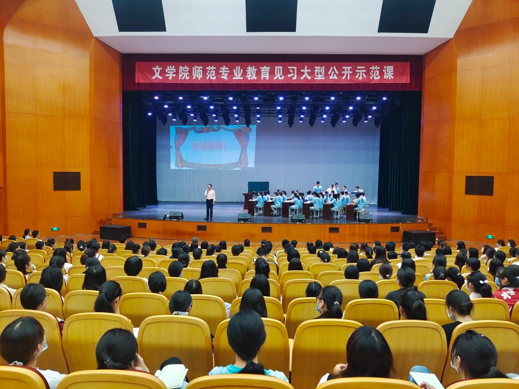 为了进一步落实人才培养方案、加强学生实践教学能力,增强对本专业学科知识的感性认识,将实践课程与课堂教学有机结合。我院于5月25日邀请南湾湖风景区中学彭涛校长、叶宁老师、中学语文教研组以及30余名中学生在我校音乐厅开展大型教育见习公开示范课。信阳学院副校长王强、教务处处长陈文涛、文学院院长毛正天、教学秘书陈浩、行政秘书陈俊、学工秘书徐远东、教务员万玲玲、2018级全体辅导员及近900名学生参加了此次活动。公开课由毛正天院长主持。