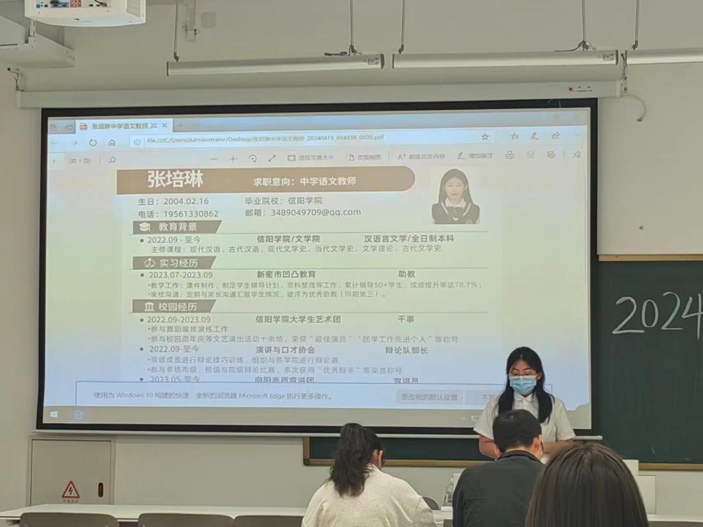 张培琳同学就个人信息、教育背景、实习经历、校园经历、获奖情况等简述自己在学习中的成果。她提到自己的求职意向为中学语文老师,为此她在暑假期间参加教育机构的实习工作,不仅锻炼了自己的能力,并且也向自己的目标靠近。在校期间,通过参与我校文艺汇演活动、参加我校宣讲团等来提升自己艺体能力与演讲能力,丰富的经历赢得了评委的认可与称赞。