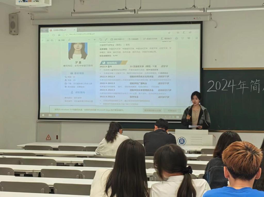 罗嘉同学在演讲过程中,从个人基本信息、在校经历、获奖情况等方面来分析自己的简历,自我定位清晰且简历清晰完整。其中她讲述到自己在担任班干部时提高了自己的管理能力,同时在学校广播电台、信阳优秀传统文化传承馆的工作也培养了自己的演讲能力。其自信大方的演讲获得了评委们的一致好评。