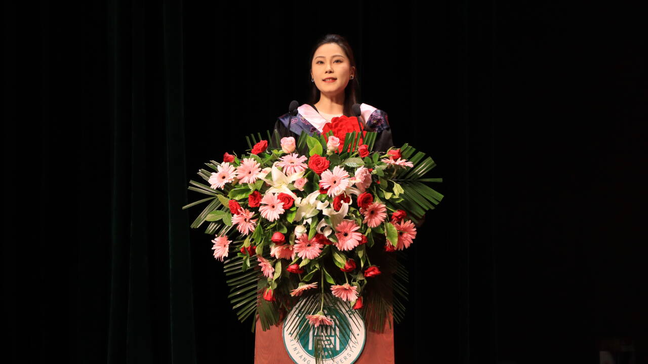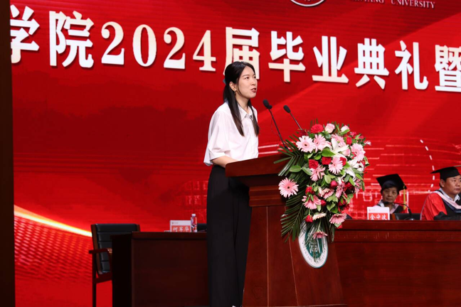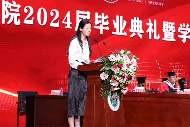 毕业生代表闫奕含发表毕业感言,她向老师们表达由衷的感谢和敬意,分享了四年来的拼搏历程与收获,继往开来,作为毕业生代表发扬校训精神,追逐美好未来。