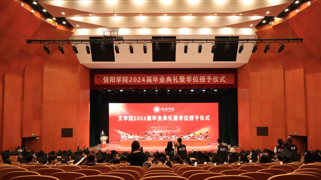 典礼在庄严国歌声中拉开序幕。教学秘书陈浩、学工干事何军华、教学副院长黄亚妮分别宣读了《关于表彰2024届优秀毕业生的决定》《信阳学院文学院关于聘任2024届校友联络员的决定》和《信阳学院文学院关于授予2024届本科毕业生学士学位的决定》。