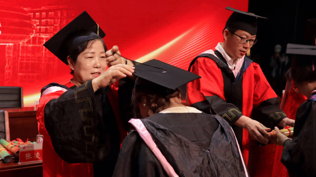 文学院院长张凌江为2024届省级优秀毕业生颁发荣誉证书。教学副院长黄亚妮为2024届校友联络员颁发聘书。文学院学位评定委员会委员为各专业毕业生正冠拨苏,授予学位。