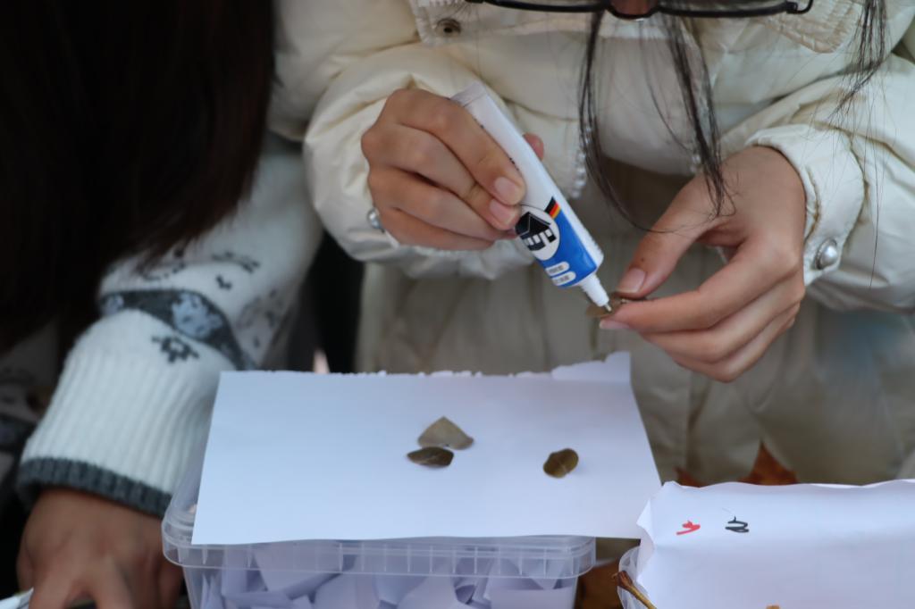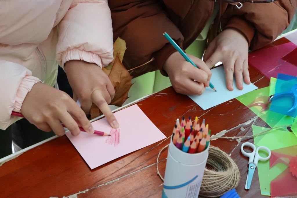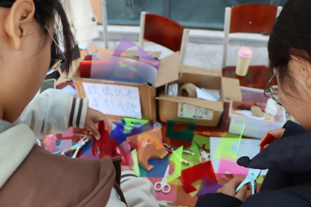 活动精心设置了六个创意环节。“纸上拾叶影”环节参与者以彩铅拓印落叶脉络,在白纸与黄叶的碰撞中定格秋的肌理;“裁璃织光,串影成趣”环节参与者用彩色玻璃纸裁剪、连缀出斑斓光影,让光线在创意中流转成诗;“片片叶,趣拼贴”以随机抽取的树叶数量为限,鼓励大家用落叶拼贴出专属的日常意趣。