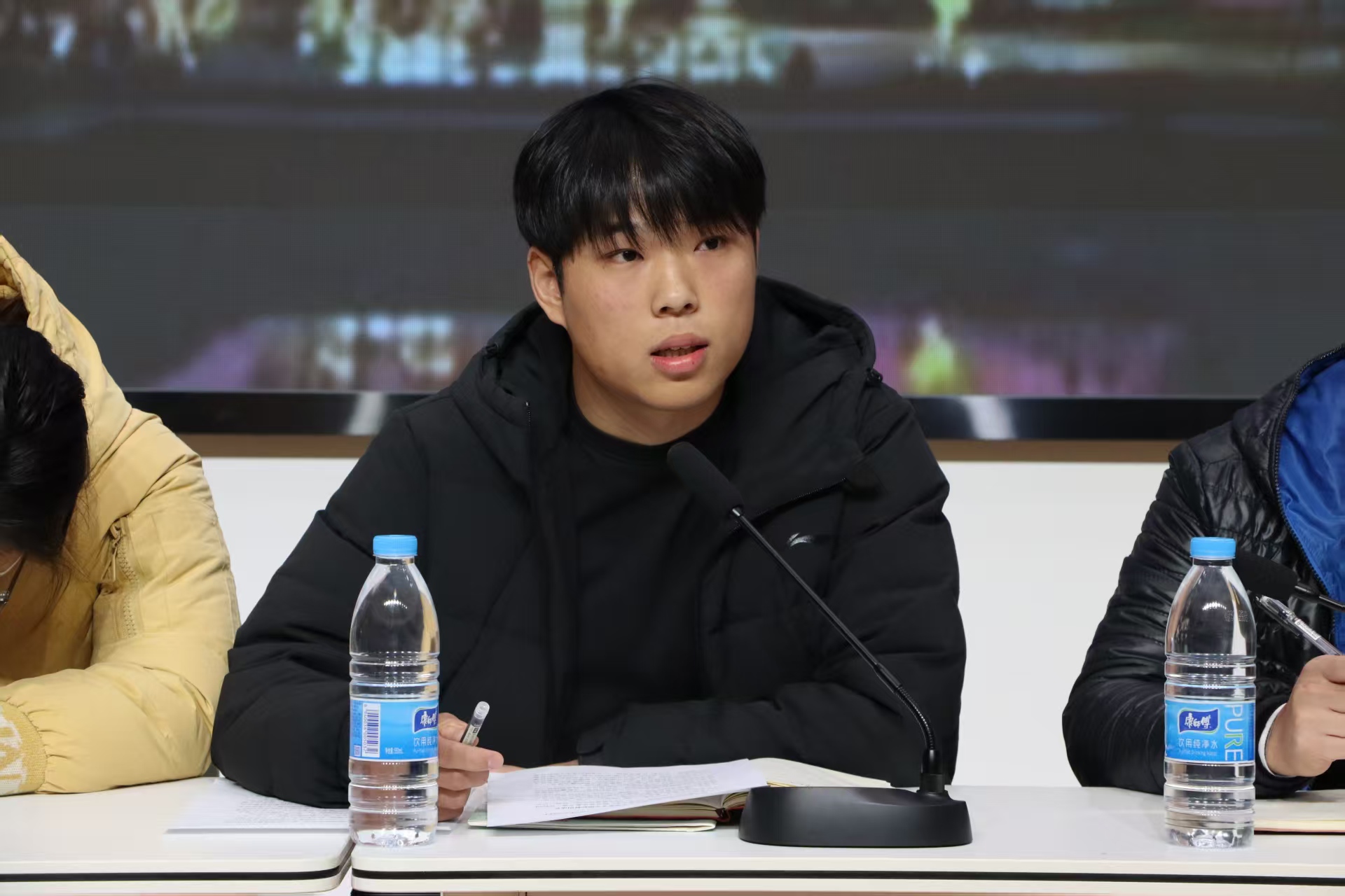 文学院学生会体育部部长张旭喆、宣讲团部长姚玉斌代表学生干部群体发表讲话。他们一致强调学生干部应努力提升自身硬实力,做好服务工作,在日常工作中“急同学之所急,想同学之所想”,积极解决同学们在学习生活中的“急、难、愁、盼”,团结一致为文学院管理工作贡献自身力量。最后,两位发言人代表学生干部群体对文学院全体领导老师致以真挚的感谢与祝福。