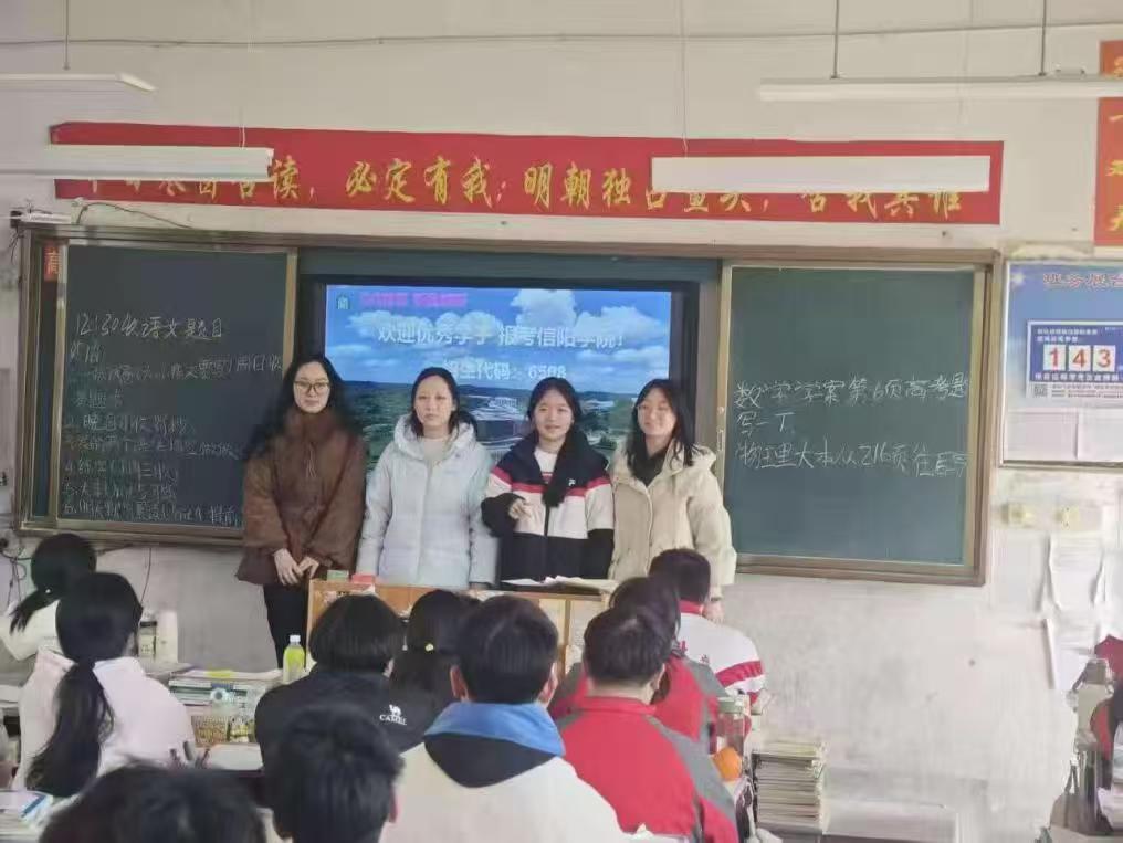 向阳而生队庞佳涵、张雨欣、佘雨霏、周玉雯来到商城县上石桥高中,以青春宣讲搭建沟通桥梁。队员们围绕信阳学院办学实力、文学院专业特色展开分享,结合自身就读经历讲述大学生活点滴;并设置互动答疑环节,针对备考心态、大学规划、专业学习等问题,耐心为学弟学妹解答,以学姐身份传递实用经验,收获现场学子的热烈共鸣。
