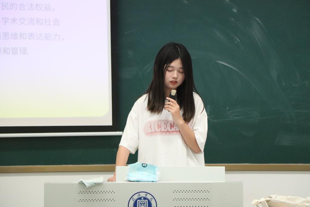活动伊始,文学院学生会组织部干事李梦璠从法治信仰的含义、法治历程、法治建设的挑战和大学生的做法几方面进行演讲。强调了法治建设的不易以及大学生的做法,利于大学生深入了解宪法知识,提升自身的法治素养。