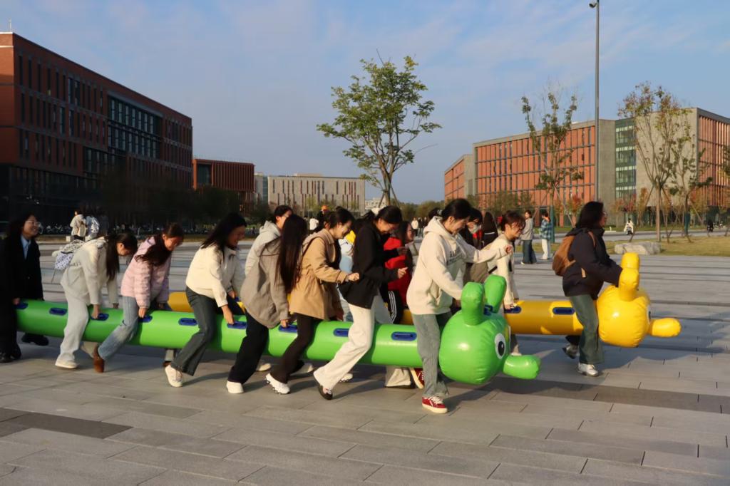 活动设置了“疯狂毛毛虫”、“传声筒”、“你来比划我来猜”、“奇异服装接力赛”四大闯关项目。在“疯狂毛毛虫”环节中,参赛队员们分组骑上色彩鲜艳的充气毛毛虫,双手紧握固定把手,在裁判一声令下后,齐心协力驾驭着道具在跑道上疾驰,现场欢笑声与加油声此起彼伏。这项比赛不仅考验队员们的体力,更考验团队配合的默契程度。