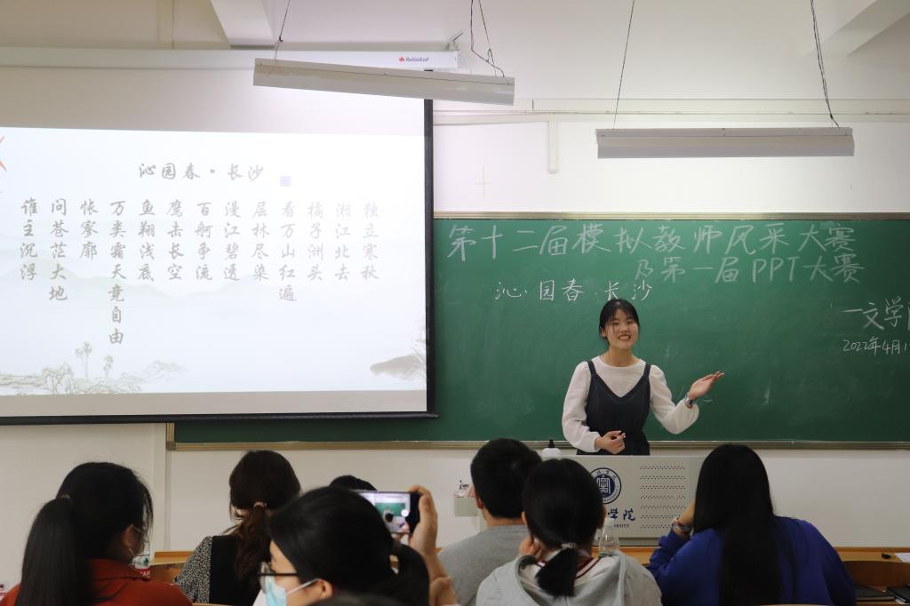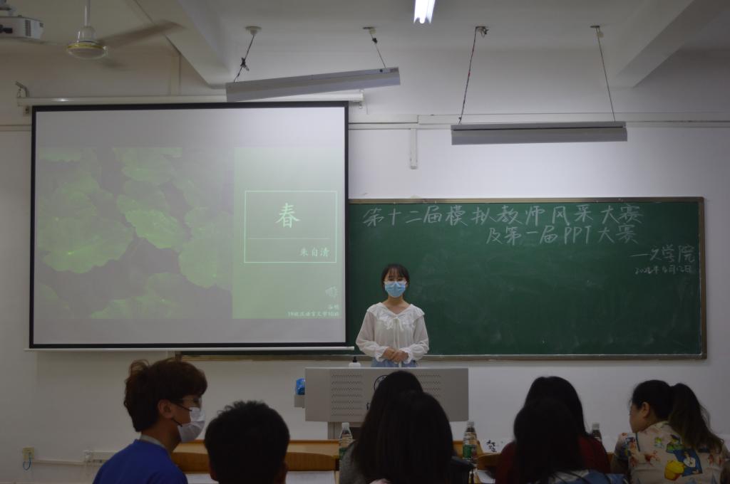 整个比赛过程中,参赛选手们通过PPT来讲解教材,生动的教学语言、得体的教学仪态、灵活的应对能力,获得了评委们的一致好评。其中,范孟何同学以一张毛主席伫立橘子洲头的图片作为切入点向我们讲述《沁园春·长沙》,从她的身上我们可以看出深厚的知识积累是作为一名教师所不可缺少的条件;刘芾以简洁明了的语言向大家讲解《归园田居(其一)》,并在课堂上积极互动,活跃课堂气氛,教法创新,极大地激发大家的兴趣;谷明由春天引出《春》,通过五个春的场面来全面描绘春日景色,运用优美的语言和生动的描述,带领学生们领略朱自清先生眼中的春。