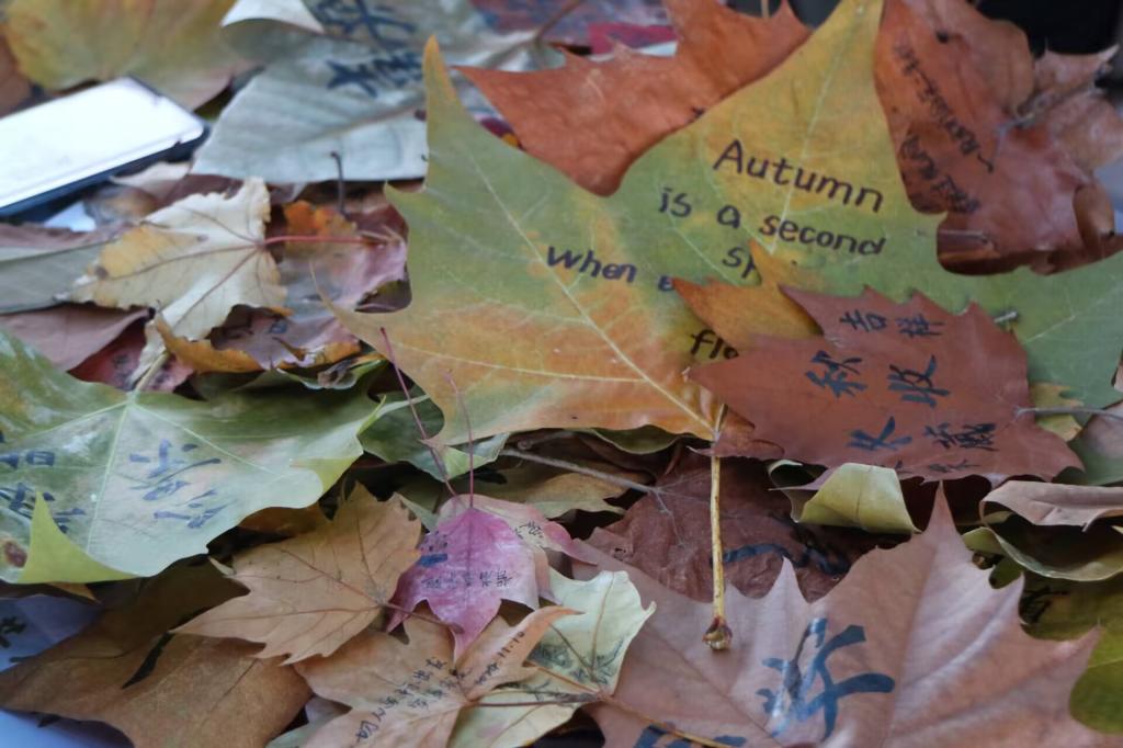 活动以线下的形式进行,同学们自行收集自己喜爱的秋叶并用软笔等在秋叶上书写自己喜欢的诗词或句子,或将收集到的树叶交由玄墨书法协会成员及其他书法爱好者进行创作。同时,本次活动也要求同学们所写内容是弘扬正能量、积极向上、符合社会主义核心价值观的,充分展现大学生对于传统文化的喜爱和对生活的热爱。