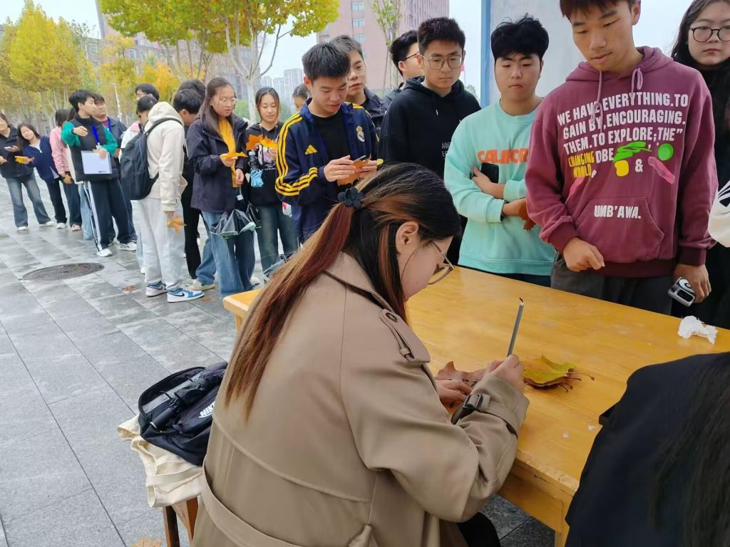 本次活动中,同学们精心收集的秋叶、浑厚有力的毛笔字,不仅有效传播弘扬了优秀传统文化,还让同学们在书写创作中感受到了优秀传统民族文化的无穷魅力。现场的玄墨书法协会成员为同学们的秋叶题字,充分调动了大家参与“金叶题字,以记秋思”的积极性,参与人员络绎不绝,活动现场热闹非凡。